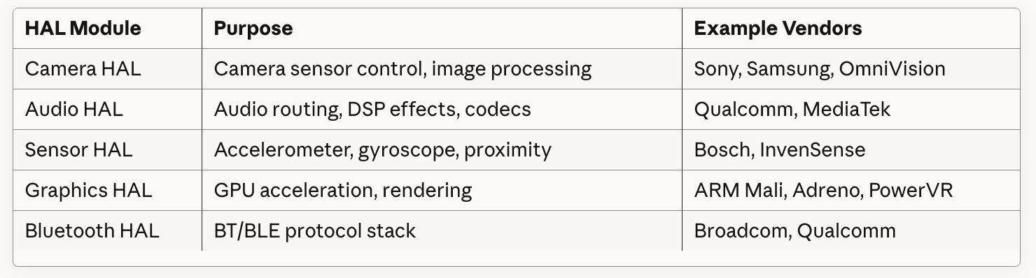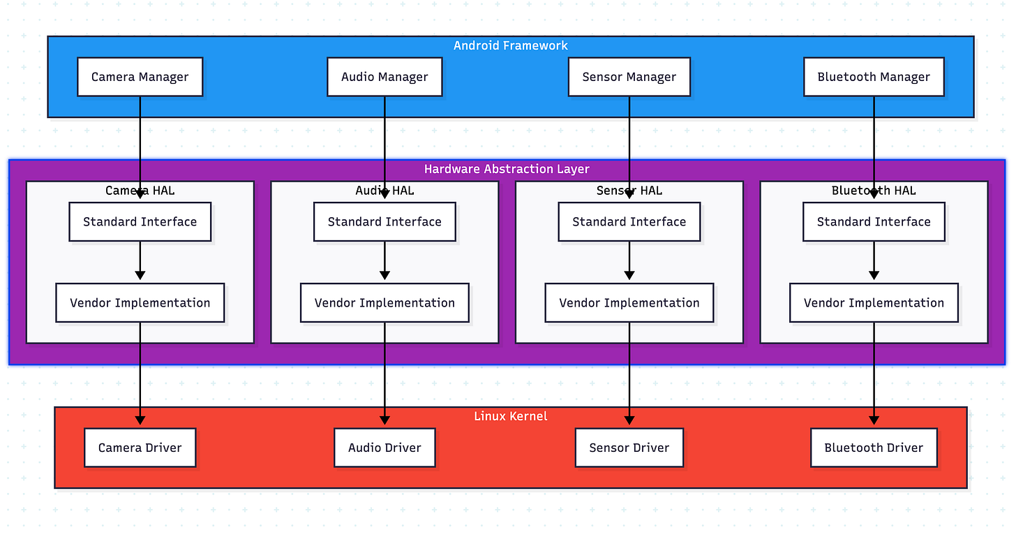 Think of HAL as a universal adapter system. Just as a universal power adapter lets you plug any device into any outlet worldwide, HAL lets Android’s framework communicate with any hardware, regardless of the manufacturer.