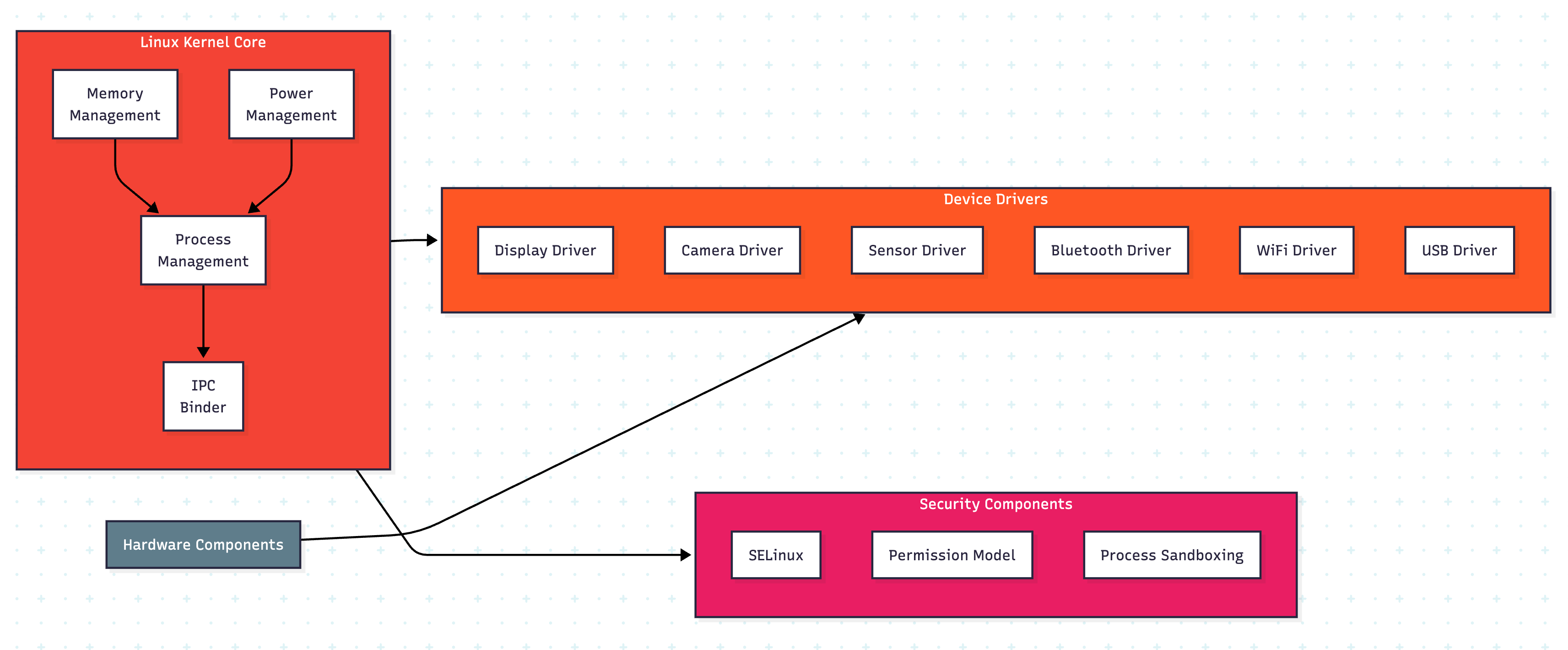 Device Drivers: Interfacing with hardware components (display, camera, sensors)