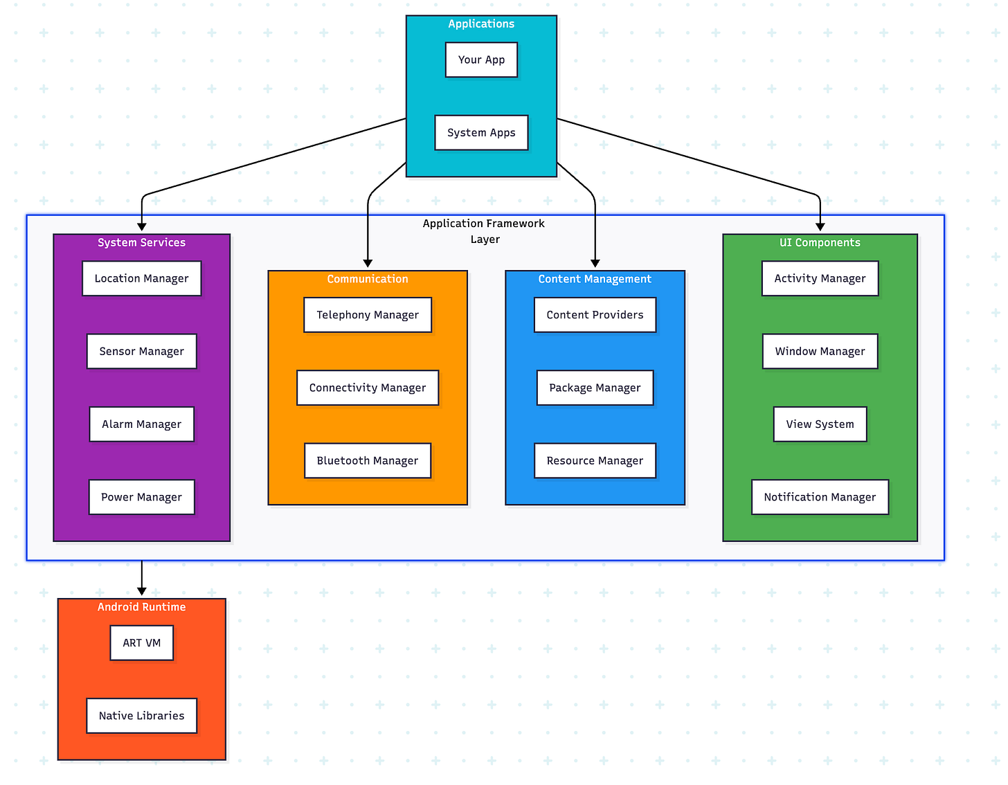 Think of the framework as a comprehensive toolbox and management office. Just as a building’s management handles utilities, security, and maintenance so residents don’t have to, the framework manages system services so app developers can focus on their app’s unique features.