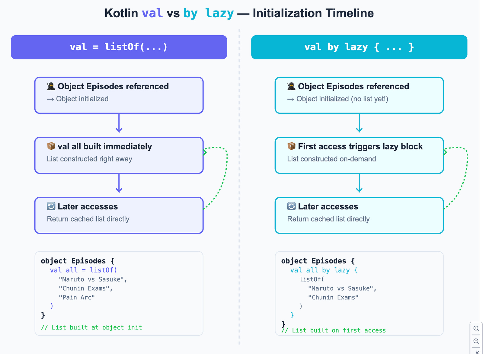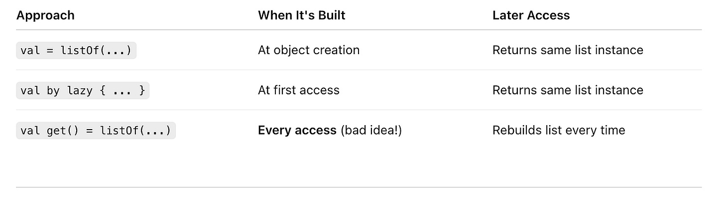 val = listOf(...)inside an object is eagerly created once when the object is first referenced.Accessing it later just returns the same instanceâââit doesnât rebuild the list every time.