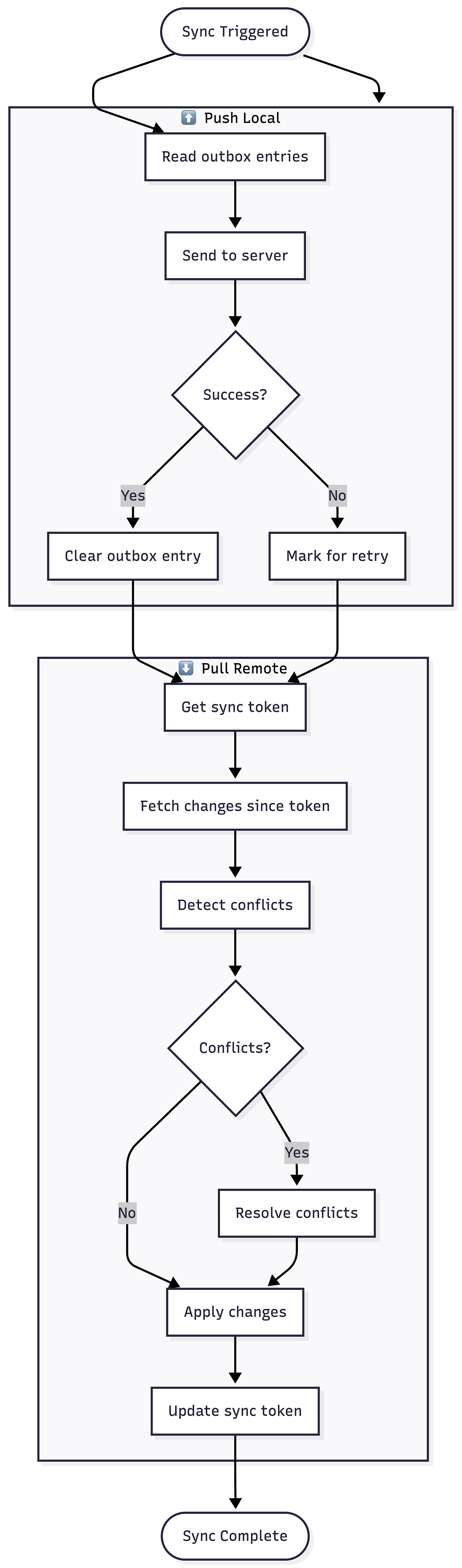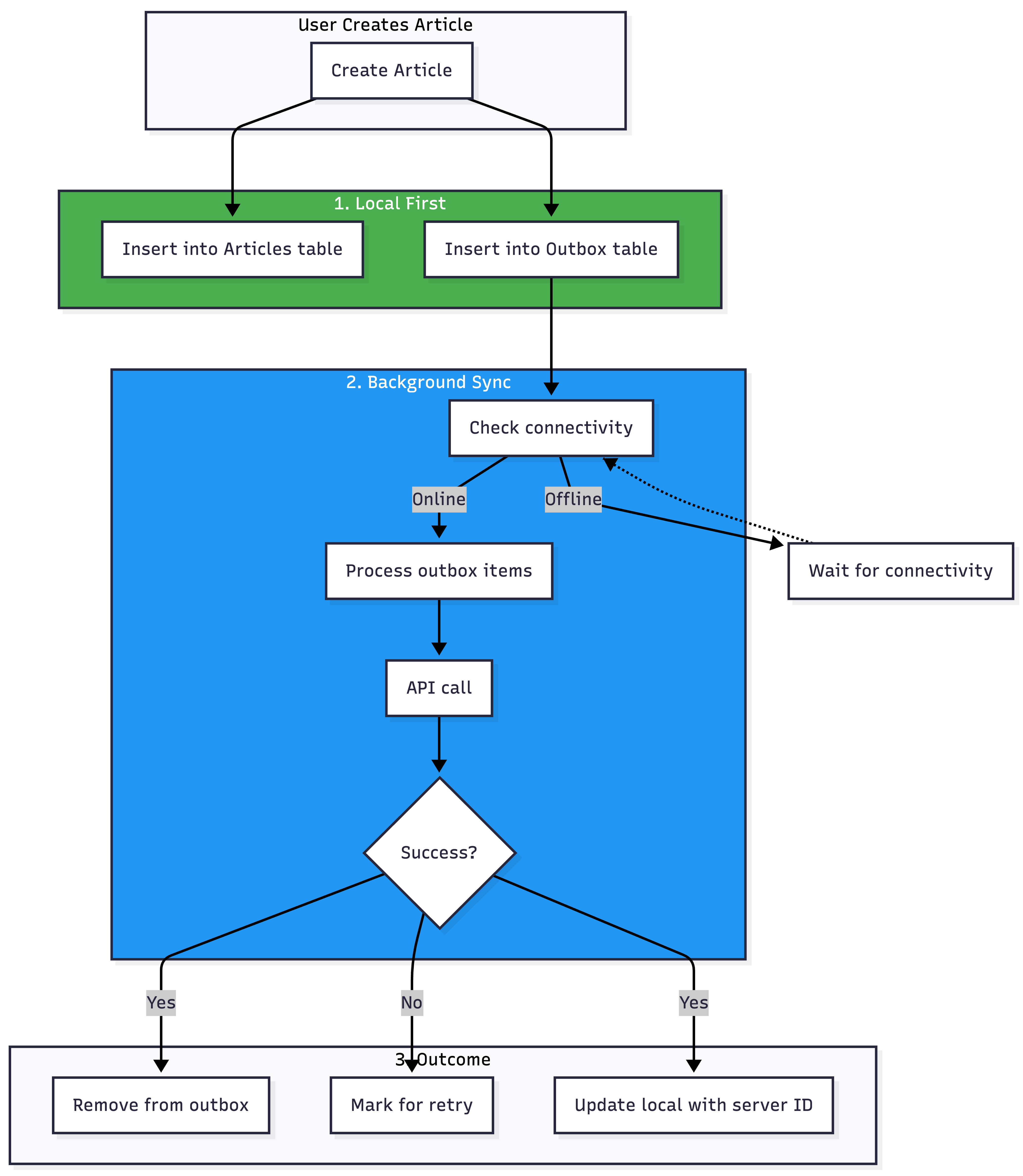 For write operations, the outbox pattern ensures no data is lost when offline.