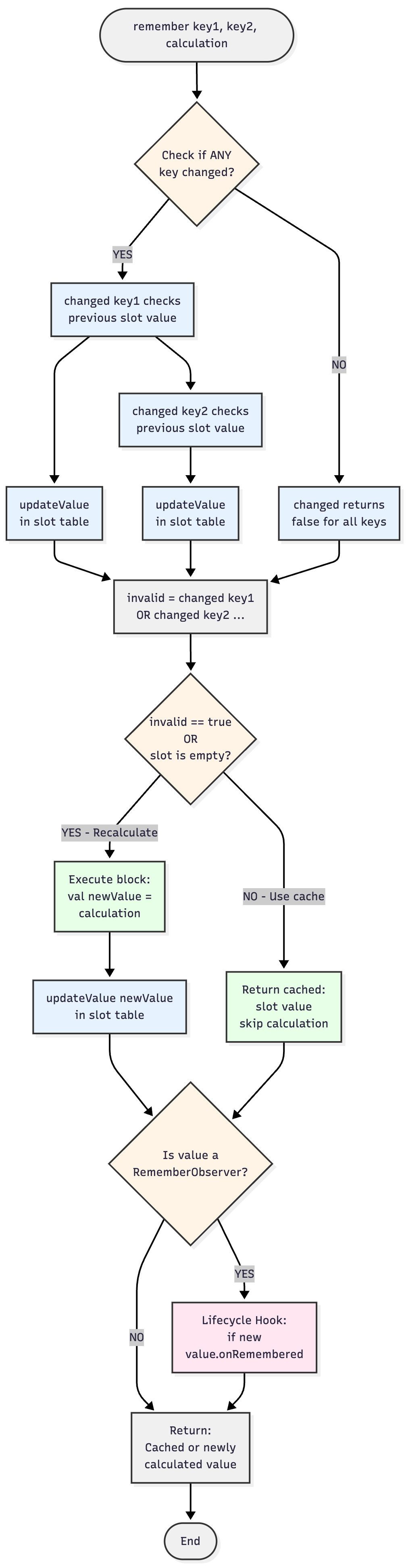 rememberAPI — Entry point with key trackingchanged()mechanism — Detects when keys have changedcache()core — The actual caching logicSlot Table — Where remembered values are stored